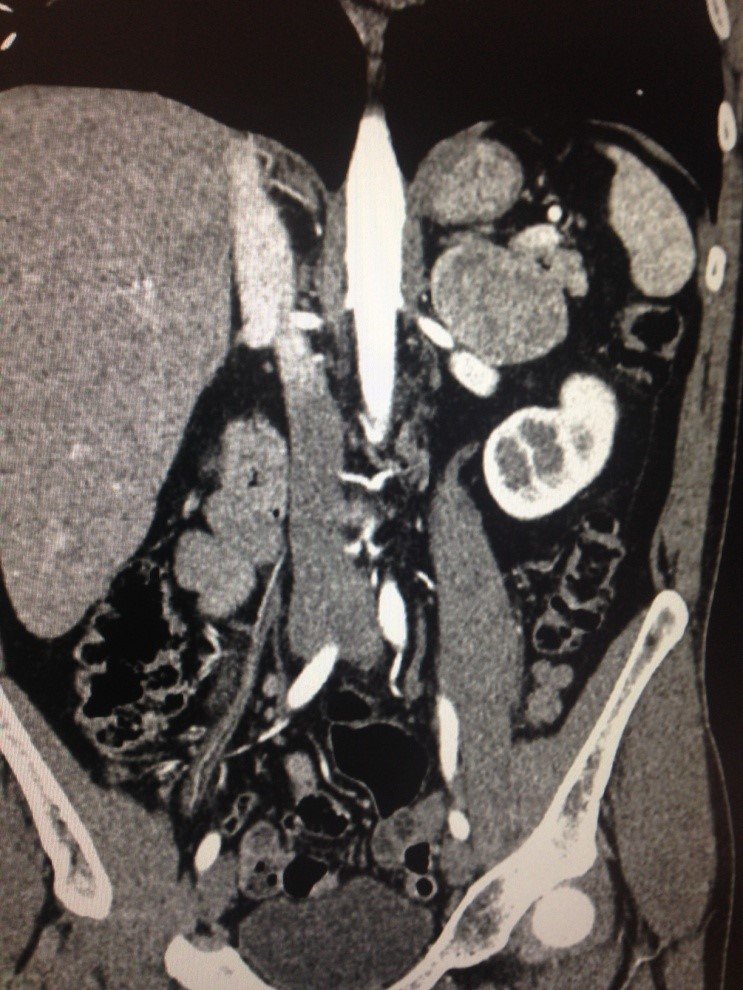 KT müayinədə kənarları qeyri düzgün, mərkəzi nekrozlaşan və ətraf orqanlara invaziya edən heterogen kütlə görülür. Limfa düyünlərinə, qaraciyərə və ağciyərlərə metastazlar görülə bilər. 9 sm dən böyük sağtərəfli törəmələr aşağı boş venaya və sağ qulaqcığa invaziya edə bilər.