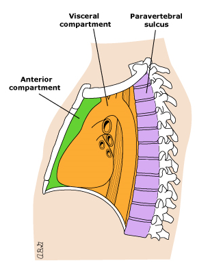 Arxa divararalığı döş fəqərə cisimləri ilə qabırğalar arasındakı sahəni əhatə edir (fəqərə-qabırğa şırımı). Burada qabırğaarası sinir və damarların proksimalı, simpatik qanqlionlar və kələf, limfatik axacaq, limfatik düyünlər və kövşək toxuma yerləşir.
