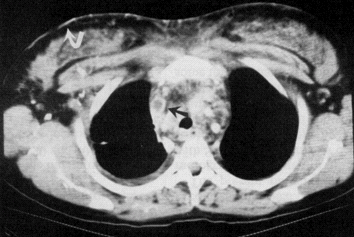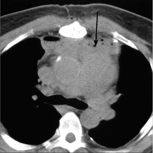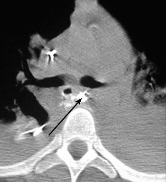 Şəkil 4. KT. Mediastinit. Divararalığı toxumasının infiltrasiyası, maye yığıntıları və qaz qabarcıqları (ox)