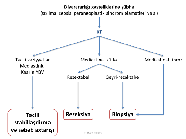 Divararalığı xəstəliklərinə şübhə olanlarda  ilkin olaraq hərtərəfli klinik və KT müayinələri aparılaraq mediastinal patologiyanın olub-olmadığı dəqiqləşdirilir. Bu müayinələrin nəticəsinə görə aşağıdakı variantlar ortaya çıxa bilər: