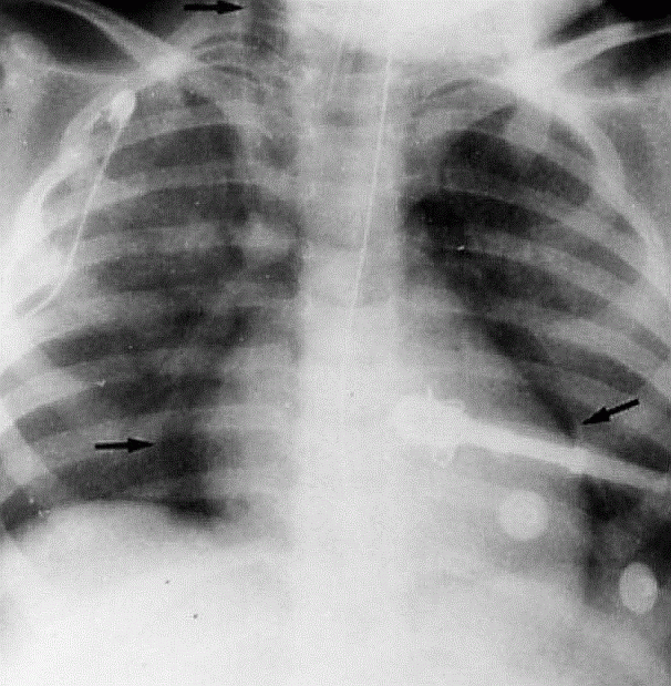 Döş qəfəsində ağrı, üşütmə-hərarət, sepsis əlamətləri, boyunda emfizema, döş qəfəsinin palpasiyasında və dərin tənəffüsdə ağrının artması, məcburi vəziyyət