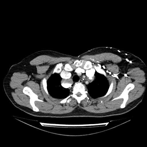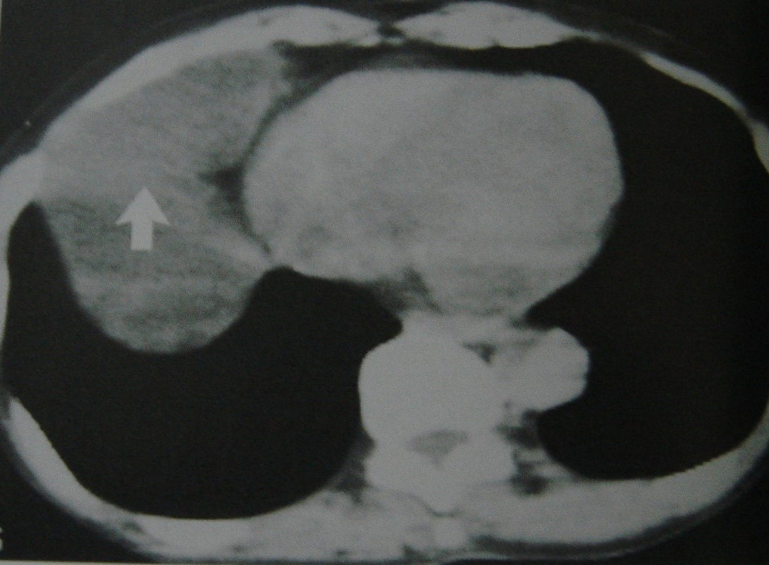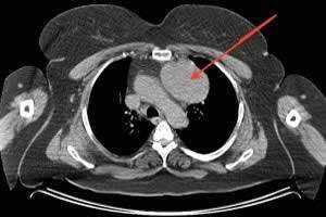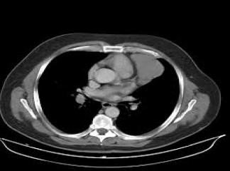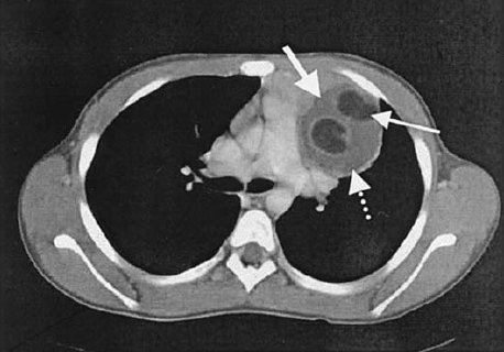 • KT – standart müayinədir. Əksər xəstəlikləri dəqiqləşdirmək üçün ən önəmli müayinə sayılır. KT mediastinitləri, törəmələrin lokalizasiyasını, formasını, ölçüsünü, sərhədlərini, ətraf toxumalarla əlaqəsini, qismən də strukturunu dəqiqləşdirən müayinədir (Şəkil 4). Lakin törəmələrin təbiətini dəqiqləşdirmək üçün adətən yetərli deyil və biopsiya ehtiyacı yaranır.