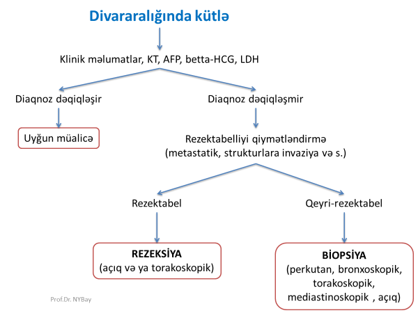 • Laborator müayinələrdən alfa-fetoprotein və betta-HCG germ-hüceyrə törəmələrində, LDH limfomalarda, asetilxolin reseptor anticimləri timomalarda faydalı ola bilər.