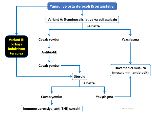 Müalicə. Crohn xəstəliyi və spesifik olmayan xoralı kolitin müalicəsinə oxşardır. 5-aminsalisil turşusunun sintetik preparatları (mesalazin, salofalk), təbii prebiotik preparatlar (mukofalk, zakofalk) və sulfanilamidlər (sulfasalazin, sulfapiridin), ikincili bakterial çirklənmənin eradikasiyası üçün antibiotikoterapia, diareyanın azaldılması üçün xolestiramin, simptomatik və dəstək (nutrision) müalicəsi tövsiyə olunur. Orta ağır və ağır dərəcəli zədələnmələrdə müalicənin steroid preparatları (prednizolon, deksametazon) ilə başlanması məqsədəuyğun hesab edilir.