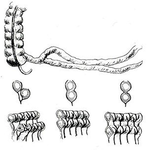 - II tip (10%) genişlənmiş proksimal seqment kor qurtarır və müsariqənin kənarından keçən qaytanla bağırsağın növbəti, yaprıxmış seqmentinə birləşir. Bəzən belə seqmentlər bir neçə olur və onları bir-biri ilə qaytanlar birləşdirir. Qaytanların mənfəzi olmur. Müsariqə defektsizdir, bağırsağın uzunluğu normal hədlərdə olur.